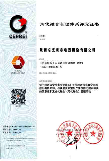 1月25日,寶光股份收到了由工信部電子第五研究所頒發(fā)的《兩化融合管理體系評定證書》,標(biāo)志著寶光股份兩化融合管理體系正式通過了國家認(rèn)證,寶光股份也成為國內(nèi)電真空行業(yè)首家取得國家兩化融合管理體系認(rèn)證的企業(yè)。