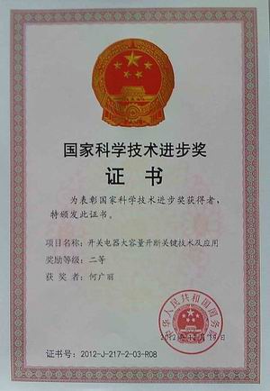 2013年1月18日,在國家科學技術大會上,由西安交通大學、陜西寶光真空電器股份有限公司、常熟開關制造有限公司、河南平高電器股份有限公司共同完成的《開關電器大容量開斷關鍵技術及應用》項目獲得2012年度國家科學技術進步獎二等獎,西安交通大學賈申利教授代表項目組到北京參加會議,并領取了國務院頒發的獲獎證書。