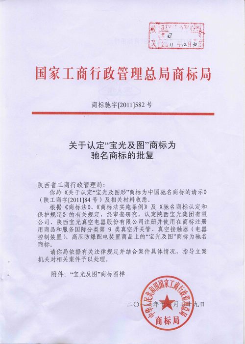 被中華人民共和國國家工商行政管理總局商標局認定為“中國馳名商標”,于2011年11月29日正式下發了《關于認定“寶光及圖”商標為馳名商標的批復》(商標馳字【2011】582號)文件)。