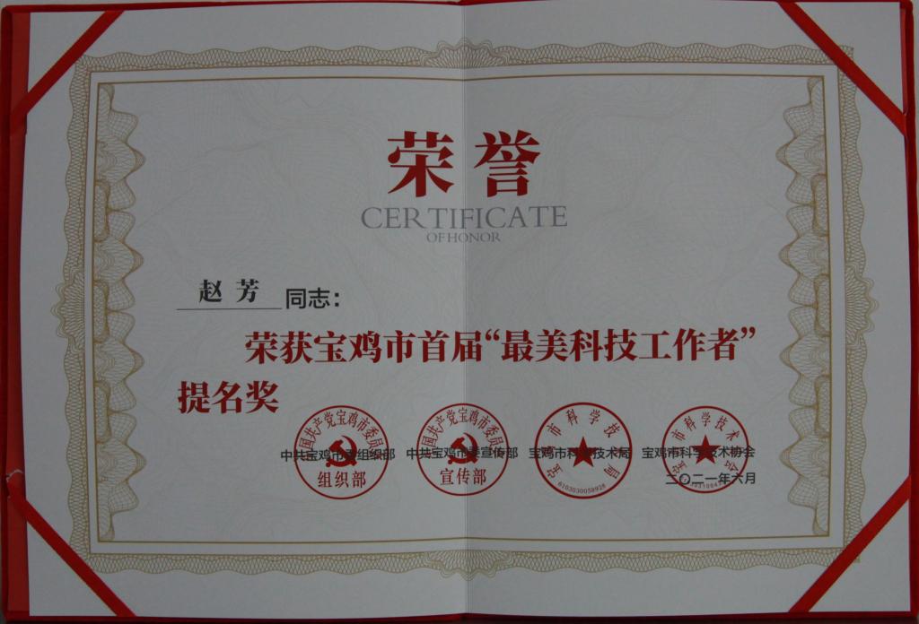 近日,寶光股份趙芳在中共寶雞市委組織部、中共寶雞市委宣傳部、寶雞市科學技術局、寶雞市科學技術協會聯合開展的“尋找寶雞最美科技工作者”評比活動中,被授予2021年“優秀科技工作者”提名獎。