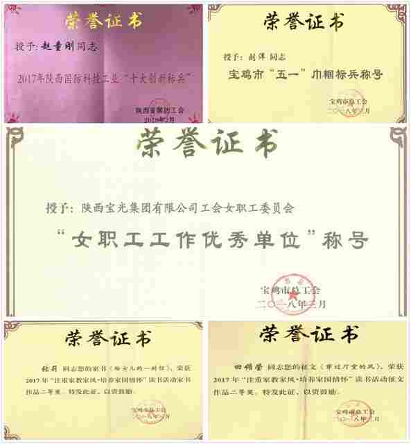 寶光集團女工委榮獲寶雞市總工會女職工工作優秀單位;精密陶瓷公司趙童剛同志榮獲陜西省國防科技工業“十大”創新標兵;進出口公司劉洋同志榮獲寶雞市“五一”巾幗標兵;C產品制造部田媚瑩同志在寶雞市“注重家教家風 培養家國情懷”讀書征文活動中榮獲二等獎;A產品制造部張莉同志在寶雞市讀書活動中榮獲家書作品二等獎。